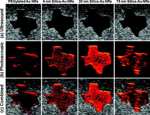 Figure 1: (a) Ultrasound, (b) photoacoustic, and (c) combined ultrasound and photoacoustic images (top to bottom) of inclusions containing (I) PEGylated gold nanorods and gold−silica core−shell nanorods with (II) 6 nm silica coating, (III) 20 nm silica coating, and (IV) 75 nm silica coating (left to right). Each image covers a 6 mm by 6 mm field of view. Source: Silica-Coated Gold Nanorods as Photoacoustic Signal Nanoamplifiers. Yun-Sheng Chen, Wolfgang Frey, Seungsoo Kim, Pieter Kruizinga, Kimberly Homan, and Stanislav Emelianov, Nano Letters 2011 11 (2), 348-354 (reprinted with permission).